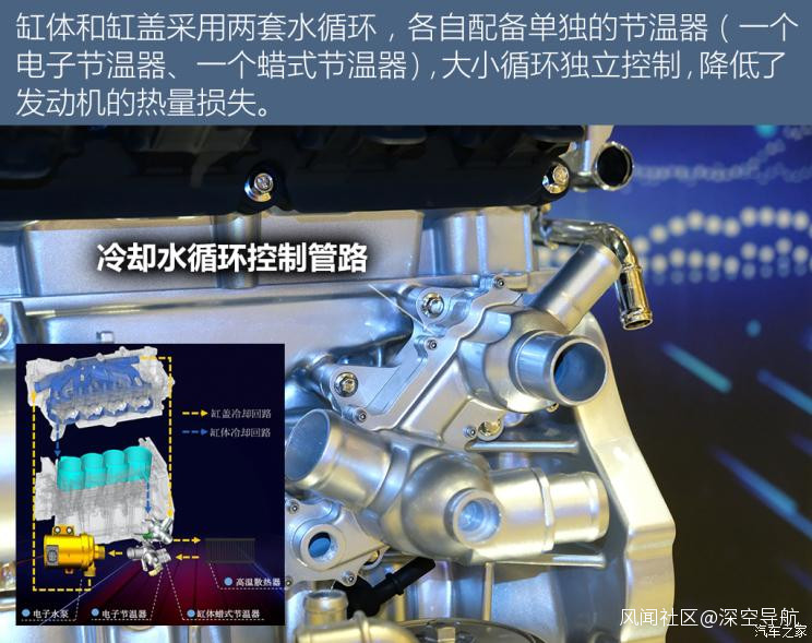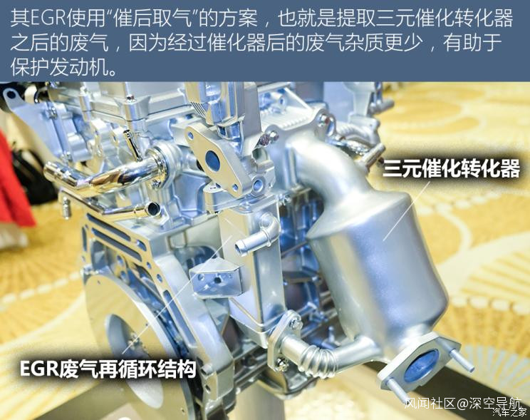 為了提升燃效,減低排放,它使用了EGR廢氣再循環技術,將一部分燃燒後排出的氣體再次引入到氣缸內,進行二次燃燒。為了提升燃效,採用了高EGR率,更多的廢氣被二次引入氣缸裏。水冷系統對高温廢氣進行降温(降到100℃左右),防止爆震、不正常燃燒等問題。