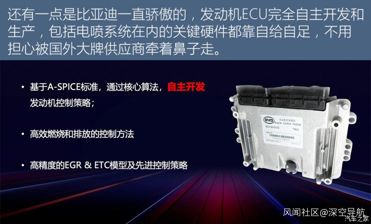比亞迪重新設計了活塞造型,提高滾流效應。並且採用小缸徑、大行程的氣缸設計,讓燃燒室內的混合氣在點火時更集中,燃燒效果更好。再輔助以阿特金森循環、冷卻EGR等技術,讓這款發動機在出如此高壓縮比的狀態下依然能有比較好的爆震控制。