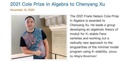 據美國數學會(American Mathematical Society, AMS)官網消息,當地時間 10 日,2021 年度科爾代數學獎(The 2021 Frank Nelson Cole Prize in Algebra)授予中國數學家、美國普林斯頓大學教授許晨陽,以表彰他在代數學領域取得的傑出成果。