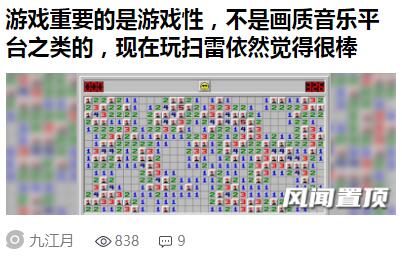 《遊戲重要的是遊戲性,不是畫質音樂平台之類的,現在玩掃雷依然覺得很棒》——九江月