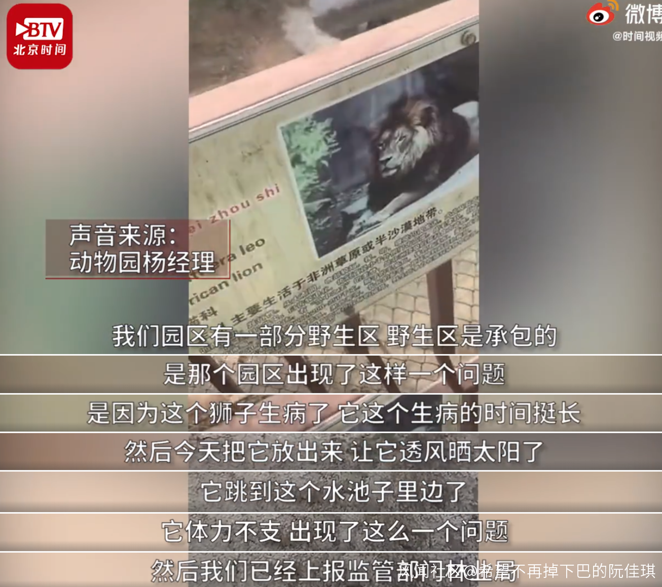 據@時間視頻 報道,動物園楊經理表示,事情發生在動物園承包的部分園區,這隻獅子生病時間挺長,在透風曬太陽時跳進水池,因體力不支溺亡。現已上報林業局,後續會發布詳細情況。
