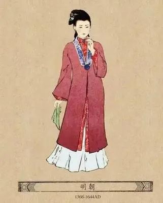 明朝女性服飾以交領為主,外着大袍(貴婦着大紅色、普通婦女只能穿桃紅色或紫綠色等淺色),露出兩三寸的長裙。
