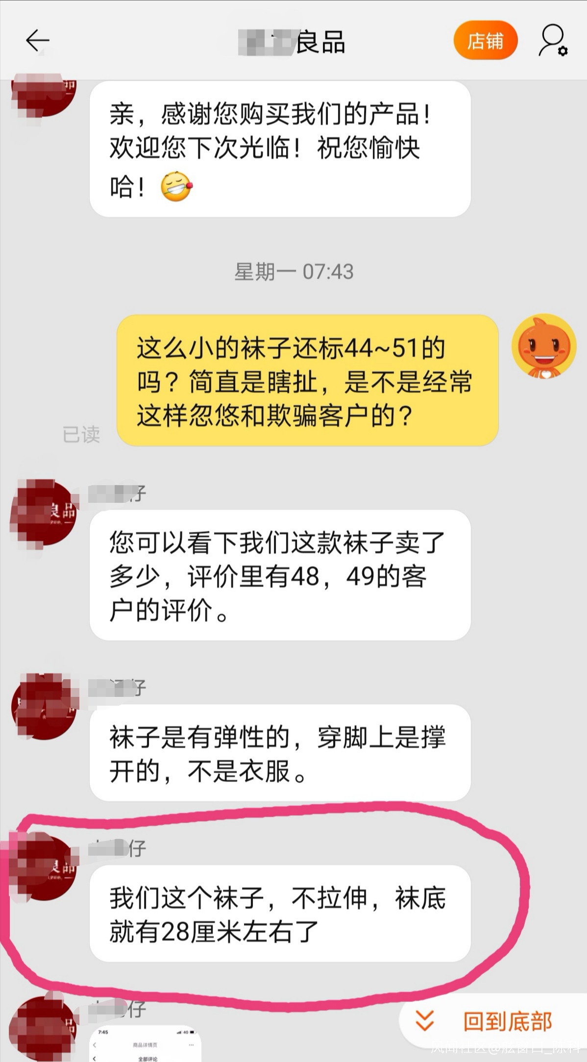 投訴時提供的證據2:客服:“我們這個襪子,不拉伸,襪底就有28釐米左右了”