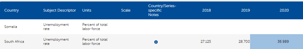 找了一下,國際貨幣基金組織對於全球各國2020年失業率預測數據顯示,南非是全球失業率最高的國家,預測為36.989%。