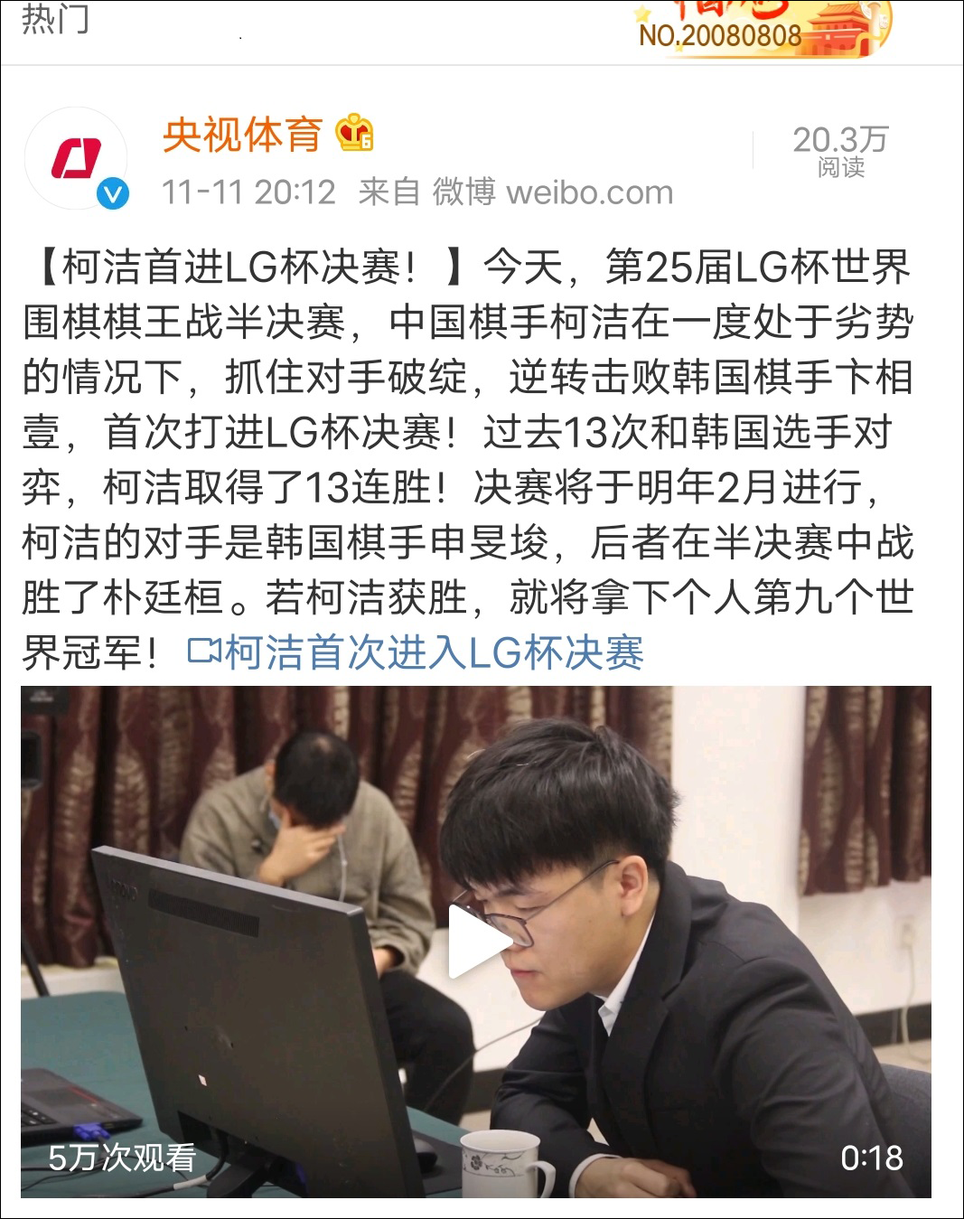 退出微博的柯潔最近又登上了微博熱搜,這一次還是憑實力。