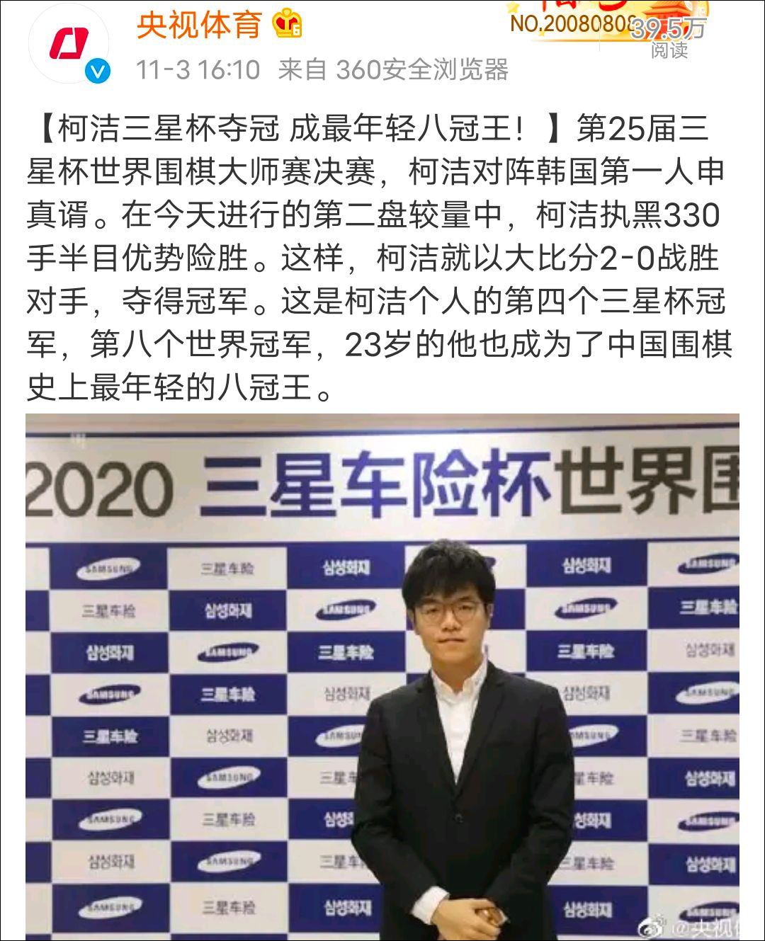11月3日,在第25屆三星杯世界圍棋大師賽決賽中,柯潔以大比分2-0完勝“韓國第一人”申真諝。由此柯潔拿下其個人生涯的第四個三星杯冠軍,第八個世界冠軍,成為中國圍棋史上最年輕的八冠王。