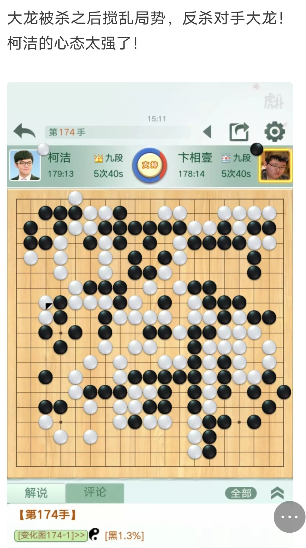 在“孤身作戰”的情況下,柯潔幾乎憑一己之力將韓國方面的優勢悉數瓦解。