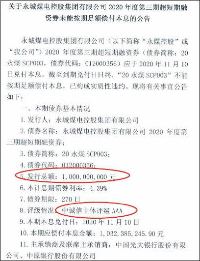 AAA債券也出現了違約,2020年11月10日下午5:35,永城煤電控股集團有限公司(以下簡稱“永煤”)發佈公告稱,“20永煤SCP003”應於2020年11月10日兑付本息。截至到期兑付日日終,“20永煤SCP003”不能按期足額償付本息,已構成實質性違約。