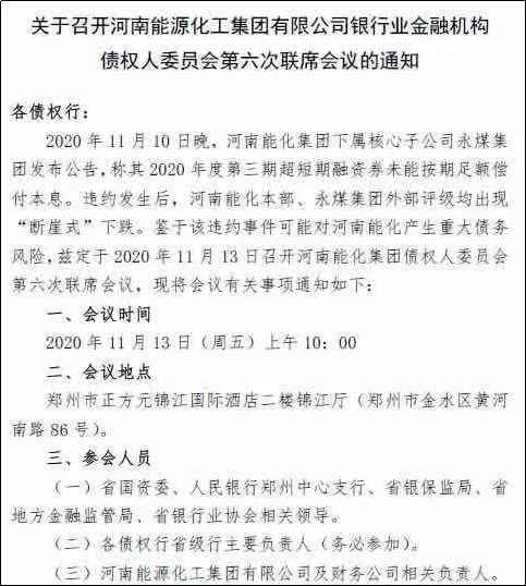 11月13日,河南能源化工集團有限公司擬於當日上午召開的債權人委員會第六次聯席會議取消。此前有媒體報道稱,會議可能討論下屬核心子公司永煤集團的違約事件。