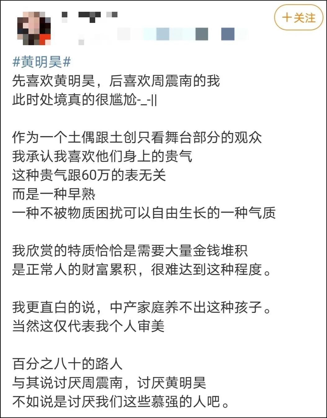 甚至最近被曝出父母是「老賴」的周震南和母親疑似為「老賴」的黃明昊,也有粉絲在事發後直言不諱,稱自己就是喜歡他們身上的「貴氣」,喜歡他們身上「不被物質困擾可以自由生長的一種氣質」。