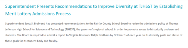 幾個月前,代表弗州費爾法克斯郡低收入地區的地方議員提出了TJ中學的招生“配額方案”,弗州的州參議員也提出了法案,要求TJ中學在本郡的每個初中最多錄取15個人,但最少也要錄取5個人,另外還要專門分配一定比例的名額給低收入家庭。