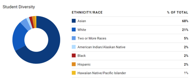 是的你沒有看錯,人口只佔當地學區五分之一的亞裔,常年統治了“第一高中”三分之二的席位。其他族裔中,白人學生佔了20%多,而黑人和拉丁裔學生,各自只有區區2%上下的佔比。也就是説一所1800人的學校中,亞裔1200多人,黑人和拉丁裔學生加起來不超過40人。