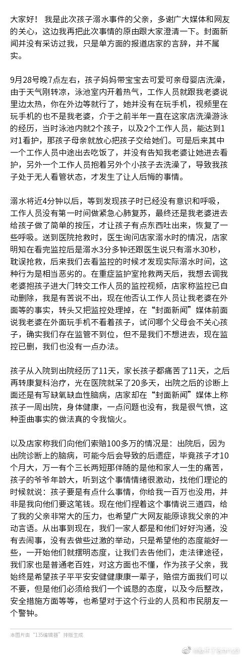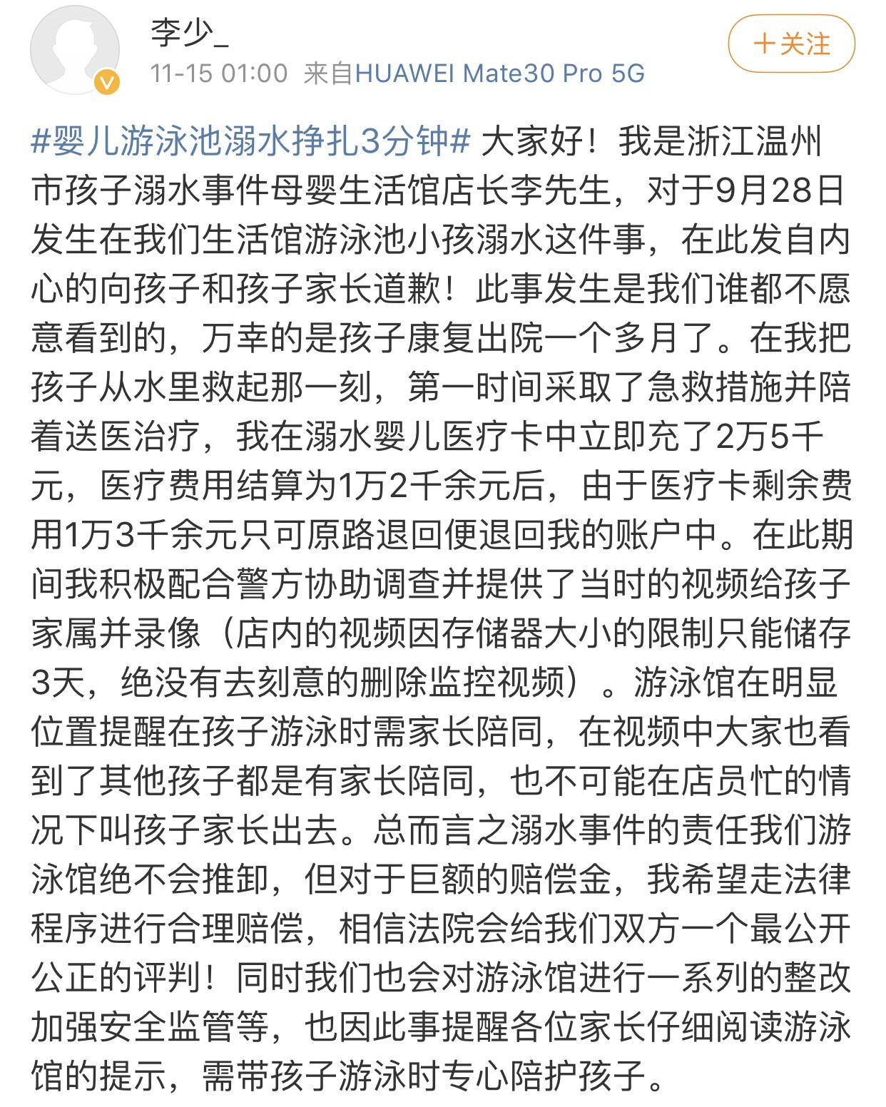 根據此前報道,事情發生9月28日浙江温州一家母嬰生活館。視頻顯示,事發時,方先生的兒子遲遲,和另一名嬰兒在水池裏游泳,水池旁站着兩名女子,期間,兩名女子抱起另一名嬰兒去擦洗,導致水池旁沒了看護人員。