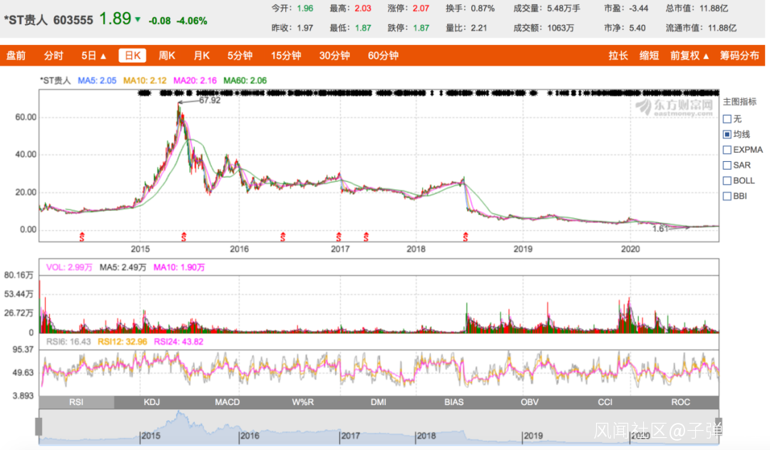 1、高空墜落貴人鳥的資本故事已很難再講下去。因為連續兩年虧損,貴人鳥被實施退市風險警示,掙扎在退市邊緣。