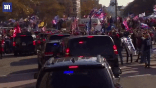 今天又註定是一個不尋常的週六。14日上午,成千上萬的川普支持者聚集華盛頓特區遊行,白宮外水泄不通!總統車隊經過,狂熱的人羣立即包圍車隊,高聲吶喊。車裏,川普揮手致意,面露燦爛笑容。而另一邊,川普的支持者和反對者相互對罵,爆發肢體衝突!