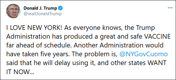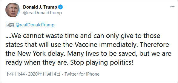 隨後特朗普繼續發推,“我們不能浪費時間,只能給那些會立即使用疫苗的州,因此紐約州得往後靠。許多生命需要拯救,而我們已經做好了準備。別耍政治把戲了!”