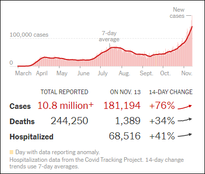據《紐約時報》數據顯示,截止到當地時間11月14日12:25,美國已有超過10,81.86萬人感染了冠狀病毒,至少24.42萬人死亡。當地時間13日一天,美國新增確診病例181194例,新增死亡1389例。