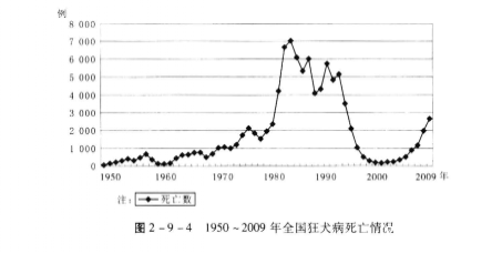 【1981年起,狂犬病年病死率居24種急性傳染病的首位。疫情上升的直接原因是養犬數量增加,缺乏嚴格的管理。估計目前全國養犬總數已達2億隻。1987年以來,我國狂犬病呈急劇上升趨勢,山東省上升4.5倍,黑龍江省上升80%。湖北、福建、貴州、江西、河北、廣西等省上升均在20%以上,病死率100%。被瘋動物咬傷人數,全國1988年達300萬人,上世紀八十年代末450萬人,估計1990年將達500萬人。遼寧省及黑龍江省一年有40--50萬人被咬傷,湖北省1987年1只狂犬1次集中咬傷10人以上的事件共23起。瘋動物傷人數我國已居世界首位,死亡人數僅次於印度,居世界第二位。