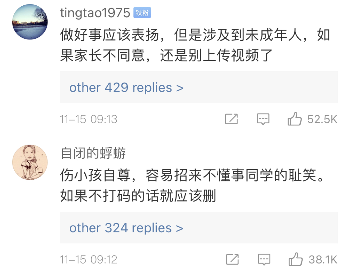 在部分網友看來,凌先生的救人行為值得稱讚和提倡,上傳視頻提醒家長的初衷也很好,但視頻在傳播過程中可能會對當事人造成傷害,畢竟涉及到未成年人,應該尊重對方父母意願,凌先生的做法有待商榷。