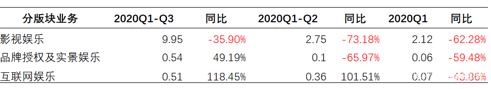 但公司對影視娛樂業務的依賴仍然沒有較大改觀。由於疫情影響,公司曾大力發展的實景娛樂業務在上半年處於停滯狀態。公司影視娛樂板塊前三季度9.95億的收入仍然佔到總收入的89.88%。