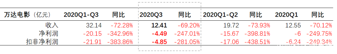 受疫情影響,公司下屬的國內影城1月23日開始停業,海外的影城也在3月底暫停營業。由於影院停業期間,仍有折舊、租金、員工薪酬等支出項,萬達前三季度虧損高達20.15億,淨利潤同比下滑超3倍。
