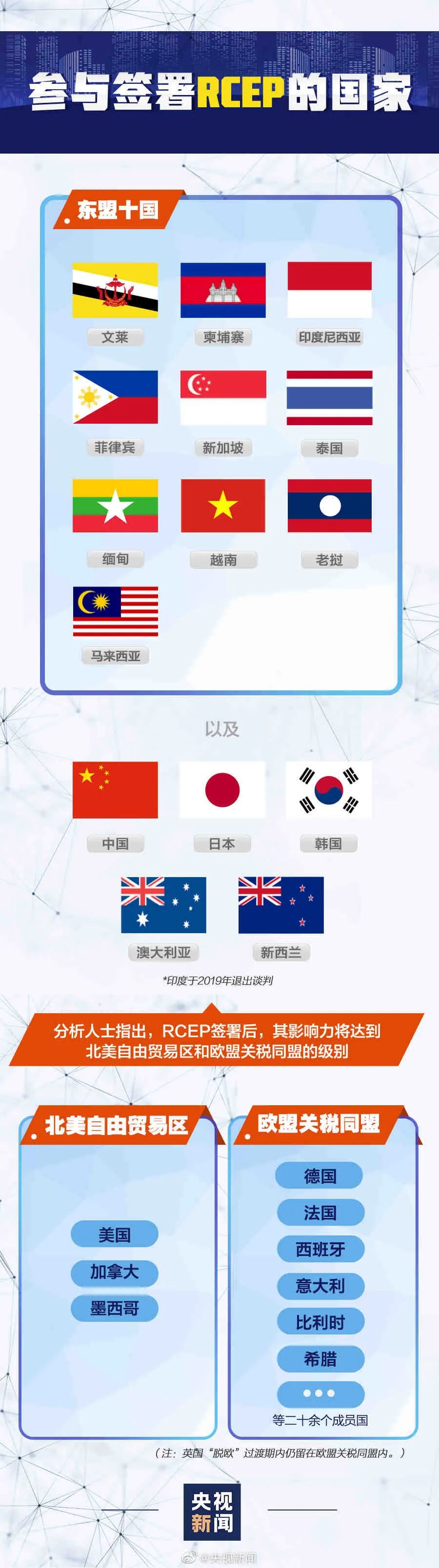 另一件發生在東亞,在“區域全面夥伴關係協定”(RCEP)第四次領導人會議期間,包括中國、日本、韓國、澳大利亞、新西蘭以及東盟十國在內的經貿部長,在協定上簽字。世界上涵蓋人口最多、發展潛力最大的自貿區建設,正式啓動。