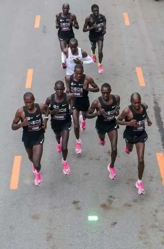 但是,這個壯舉並不是基普喬格一個人完成的——這位老將周圍有着一圈“陪跑”,5人在前,組成V字形,另有2人在後,分列左右。