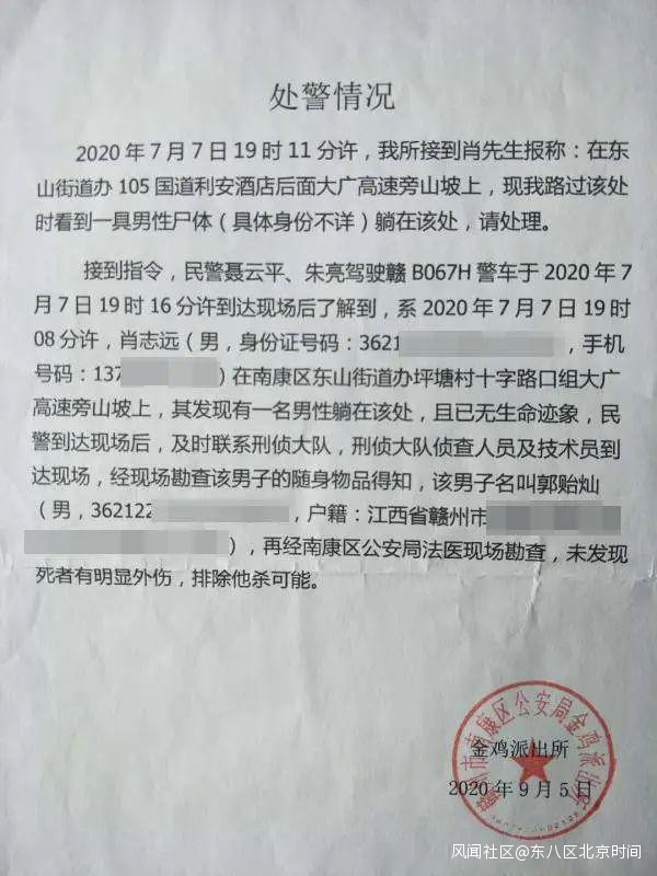 南康區公安局金雞派出所出具的《處警情況》顯示,死者身份確定為郭貽燦,“經法醫現場勘查,未發現死者有明顯外傷,排除他殺可能。”