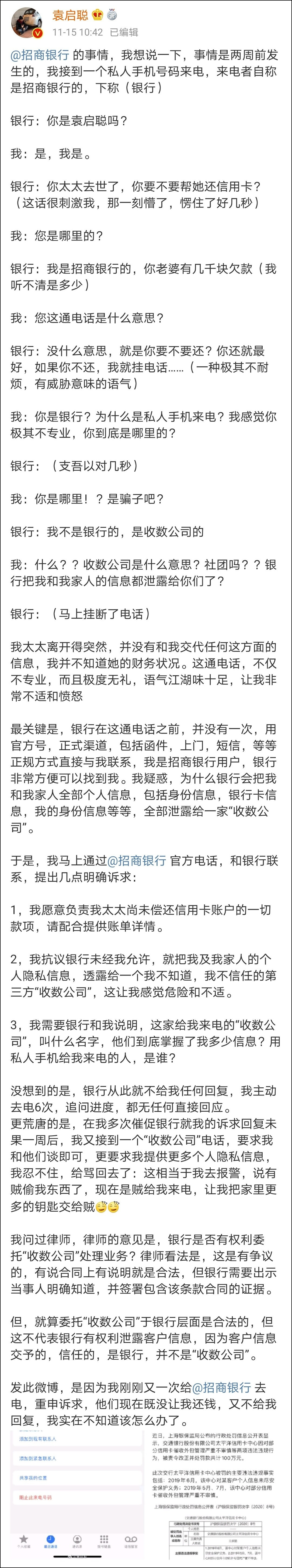 11月15日,資深車評人袁啓聰發微博稱,自己兩週前接到了一通“江湖味十足”的催收電話,來電者要求他替已故妻子償還信用卡欠款。