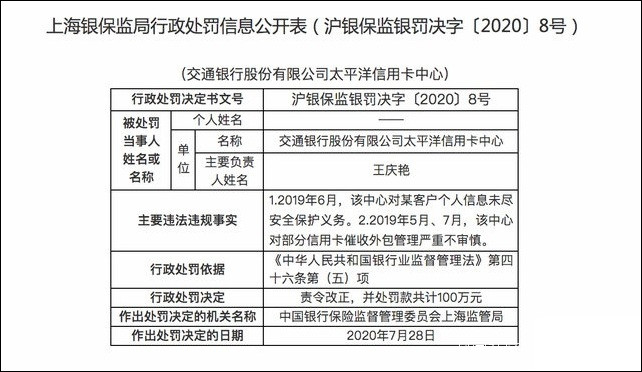 今年8月5日,上海銀保監局公佈多張罰單,劍指轄內銀行機構的違法違規行為。其中,交通銀行太平洋信用卡中心和招商銀行信用卡中心因信用卡催收外包管理不審慎、銀行對客户個人信息未盡安全保護義務等違法違規行為,分別領罰100萬元。