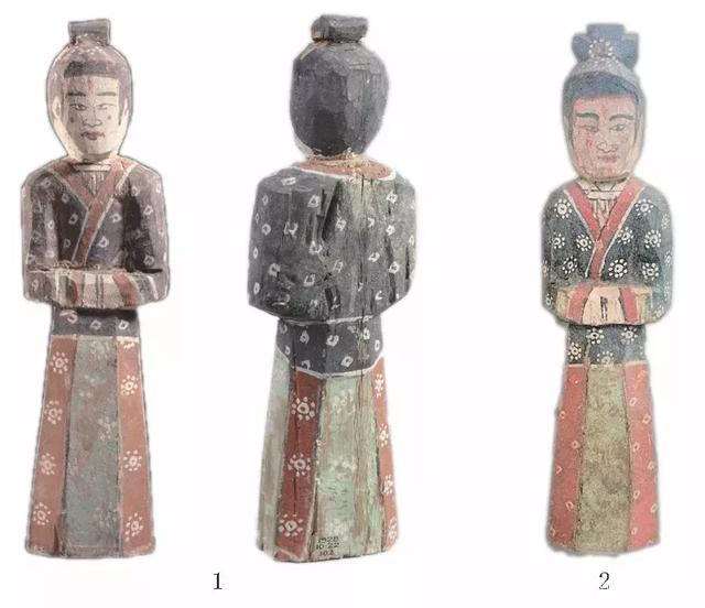 阿斯塔那Ast.vi.4號墓出土的兩個木俑:這是斯坦因1915年在新疆吐魯番阿斯塔那十六國時期古墓的木俑,該墓沒有明確紀年,但在與其墓葬形制幾乎完全相同的Ast.vi.1號墓門外側曾發現一枚上書“昇平八年”的木簡,年代相當於364年,故Ast.vi.4號墓很可能也屬於這一時期。