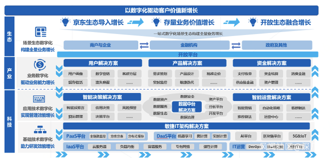 外部宏觀環境和資本市場創造了機遇窗口。金融科技在多年政策要求及市場認同下趨於成熟,新冠疫情和“新基建”浪潮影響加速了產業數字化的步伐。京東數科自我定位為首個“數字科技公司”。它將在產業數字化單點應用向連續協同演過程中進行業務開拓。