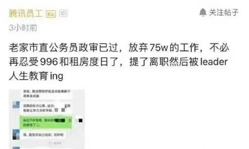 近日,有網友發帖稱自己決定回老家做公務員,放棄騰訊75萬年薪,不必再忍受996和租房度日了。