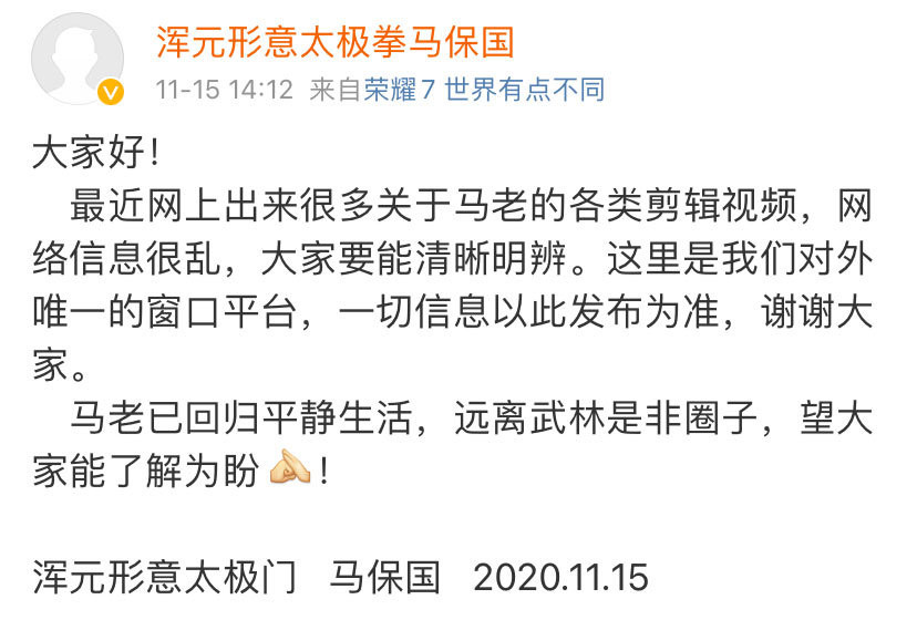 就在筆者正認真學習馬保國老師有關“武德”的諄諄教誨時,他卻通過個人微博公開表示:“已迴歸平靜生活,遠離遠離武林是非圈子,望大家能瞭解為盼!”