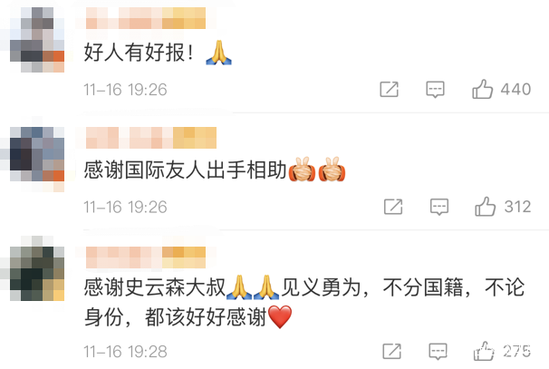 此事在社交媒體上引發關注後,中國網友對史雲森的行為點贊。