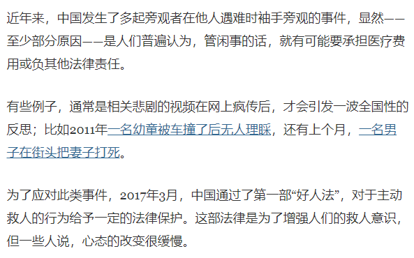 第二個原因是:近年來,中國發生了多起旁觀者在他人遇難時袖手旁觀的事件,顯然——至少部分原因——是人們普遍認為,管閒事的話,就有可能要承擔醫療費用或負其他法律責任。