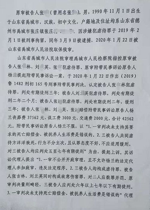 一審判決顯示,被告人張某林犯虐待罪,判處有期徒刑三年;被告人劉某英犯虐待罪,判處有期徒刑二年二個月;被告人張某犯虐待罪,判處有期徒刑二年,緩刑三年;被告人均賠償附帶民事訴訟原告人喪葬費37562元、誤工費3000元、交通費2000元,合計42562元。