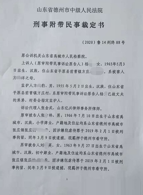 該報道中,方某洋家屬的代理律師張金武稱,此案後來由德州中院發回重審,將於11月19日上午在禹城法院開庭。