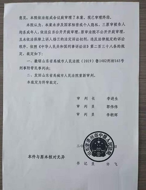 在張金武的幫助下,方某洋家屬向德州中院提起上訴。德州中院認為,本案未涉及國家秘密或個人隱私,三原審被告人均系成年人,依法應當公開開庭審理,原審法院不公開開庭審理,且未依法保障上訴人的法定訴訟權利,違反法律規定的訴訟程序。