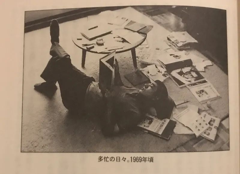 另一張圖,是日本作家、導演寺山修司躺在家中茶几旁邊的地板上翻看一本大書。茶几上和他身邊散落了各種紙張和書籍。