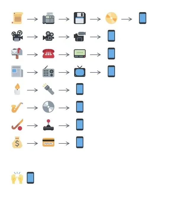 關於紙書佔據空間的問題,我看到過兩張令人印象深刻的圖片。一張是Chris Maddern做的 「繪文字圖解百年進步史」:電影放映機、電話、蠟燭、錢幣、樂器、紙張,都在一步步演變下變成了手機。