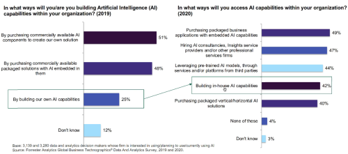 在Forrester的另一份相關領域的報告中,可以發現越來越多的企業開始重視自建AI能力,受訪企業意願比例從25%提升到了42%: