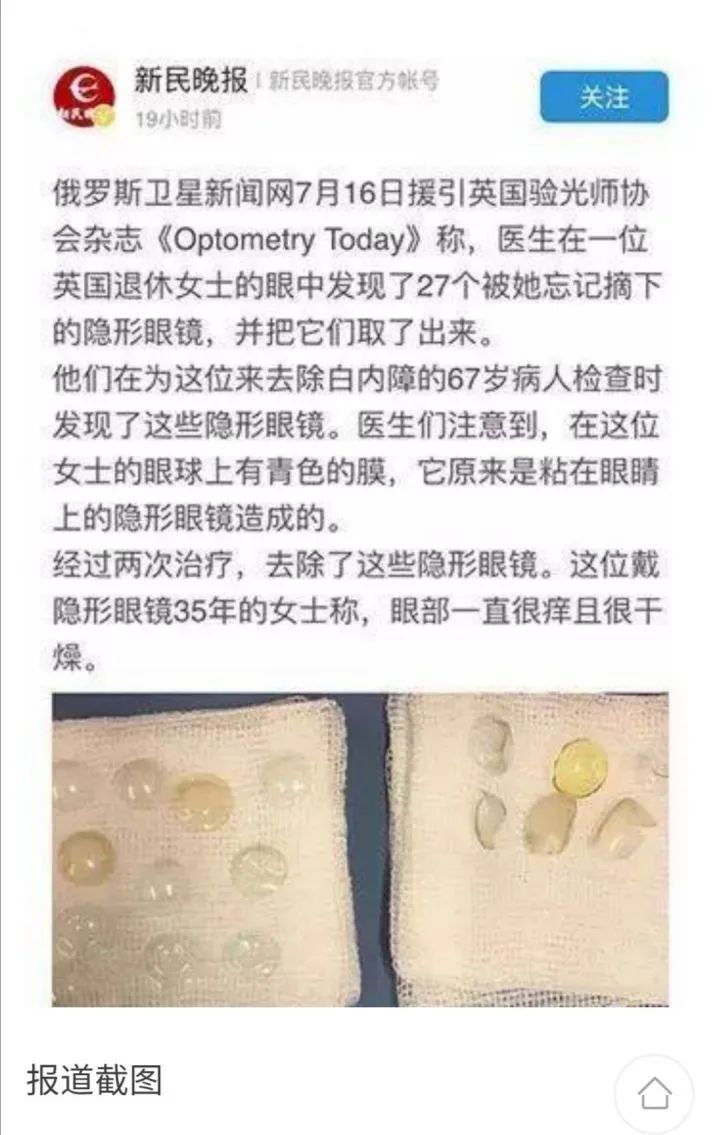 她説她有一天戴隱形眼鏡,戴完以後突然發現看什麼都是模糊的。本來她覺得就是隱形眼鏡沒戴上去掉地上了,結果不小心在網上搜索了一下。