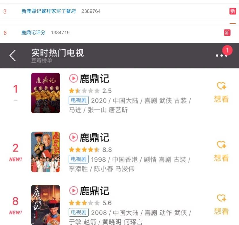 “鹿鼎記評分”“新鹿鼎記鰲拜家寫了鰲府”話題,立刻就登陸了微博熱搜榜高位。連帶着陳小春和黃曉明版本都迅速躥升到了豆瓣實時熱門書影音榜前列。