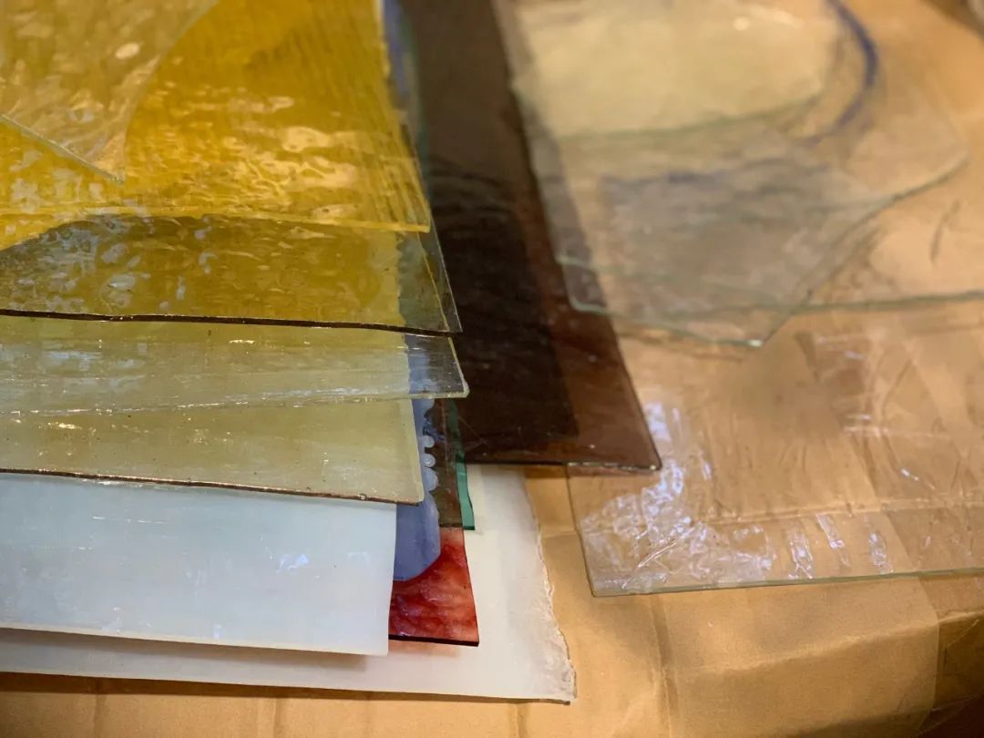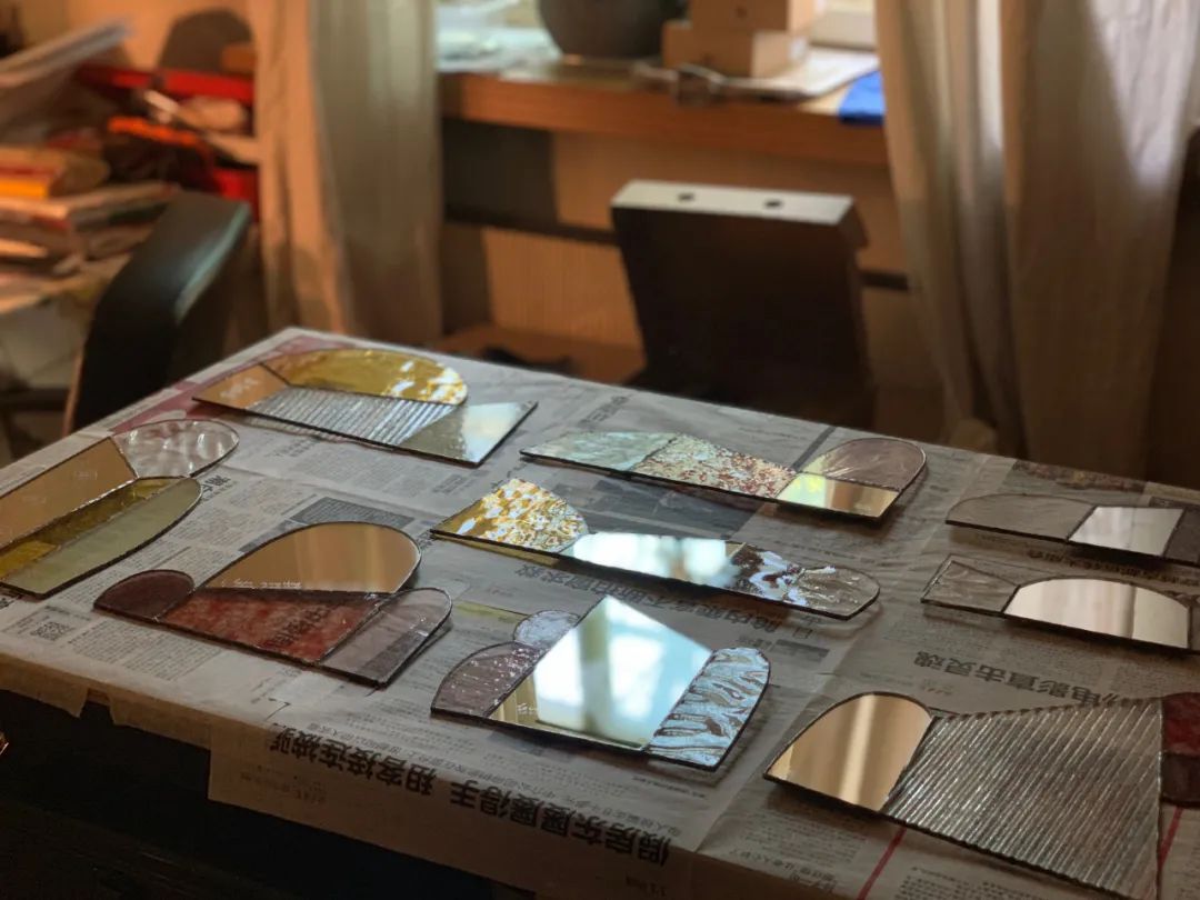 做這組作品的時候,我用了一個技法,叫做「粉燒」。它是把玻璃的粉末用很低温的條件燒在一起,那個狀態有點像糖渣兒融化以後剛剛好粘在一起的樣子。所以這時候的玻璃很脆,一掰就斷。大家也能看到上面的照片中間那個板子上碎掉的部分。失敗率還是挺高的。