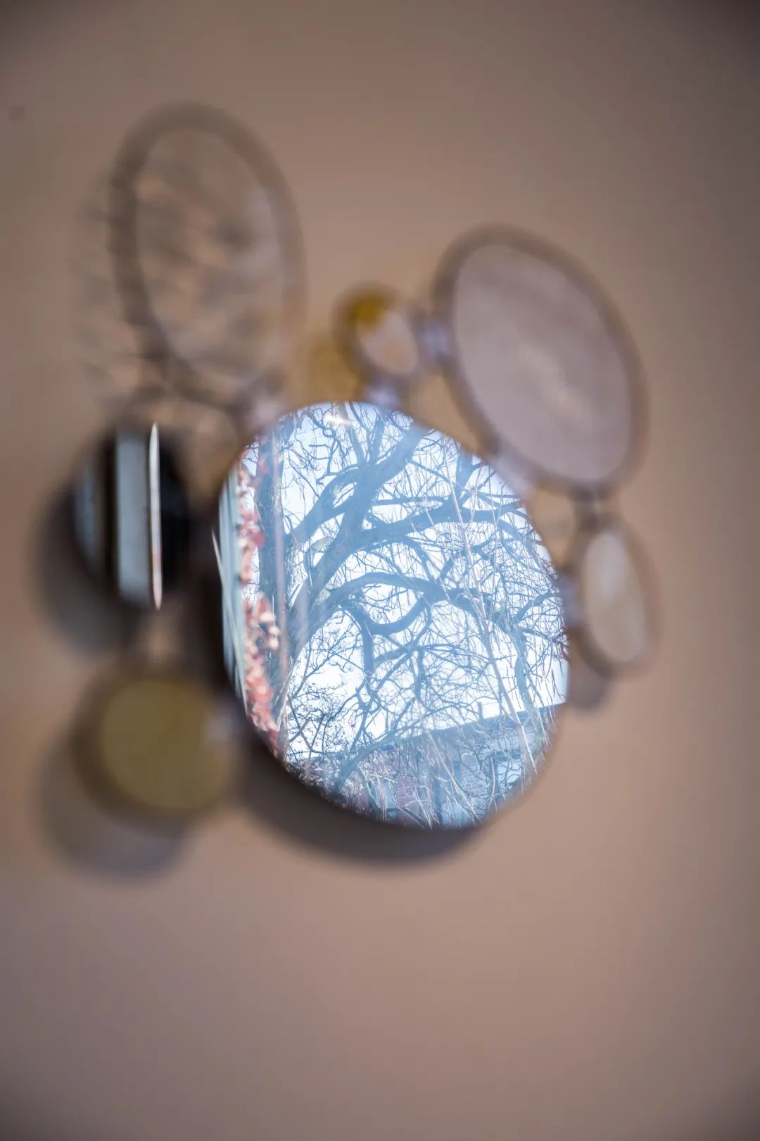 還有一組作品,想法來自於那些要被拆掉的老房子。老房子拆掉之前,會在牆上很粗暴地畫個大圈,裏面寫個「拆」字。我很想紀念這些被拆掉的房子,就做了很多像小相框一樣的圓片,因為我覺得相框裏承載的每張照片對於生活在同一屋檐下的人來説都是很重要的。我把這些小相框串聯在了一起,像「拆」字外面的圈一樣。