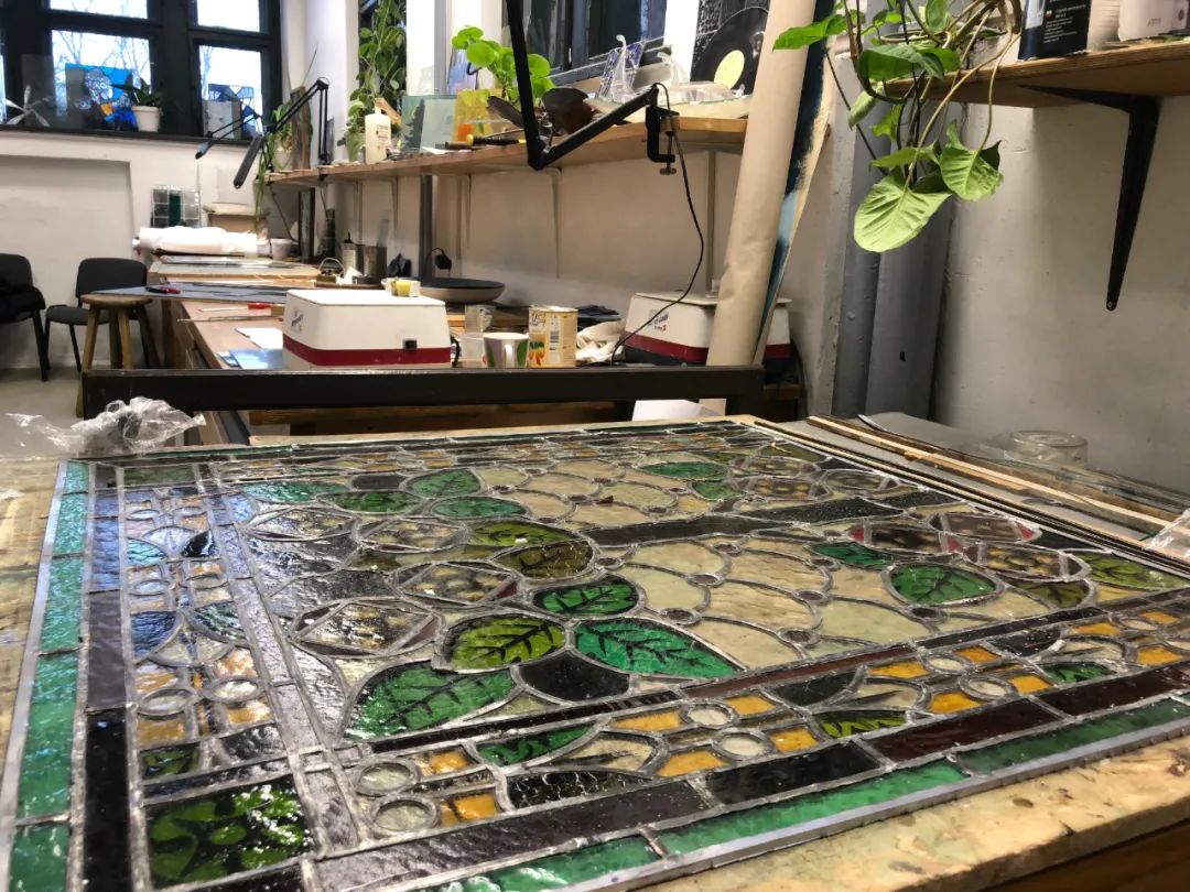而且他們學校的玻璃專業有一個傳統,就是玻璃系的學生在每個假期會對玻璃窗進行維護。我去的時候,他們正好在修其中的一塊。我就一邊看着一邊學習了一些新的技能。