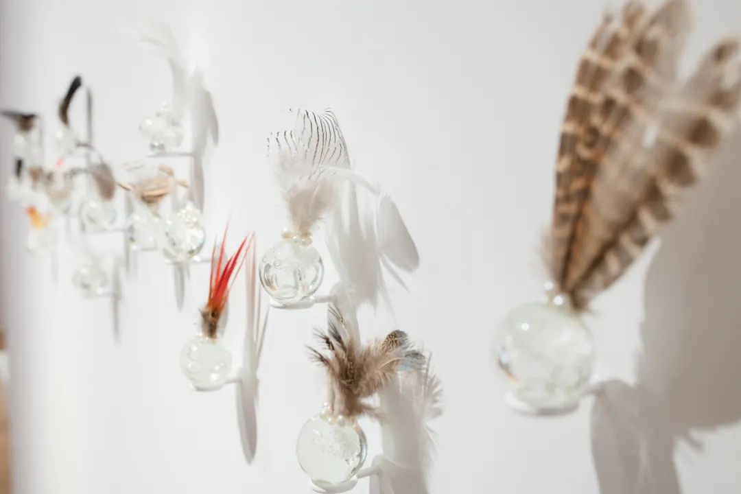 2017年的冬天,北京的近郊發生了一場大火,帶走了很多人的家。我就在這個透明的充滿氣泡的玻璃球上,加了很多羽毛,做了這樣一組作品。