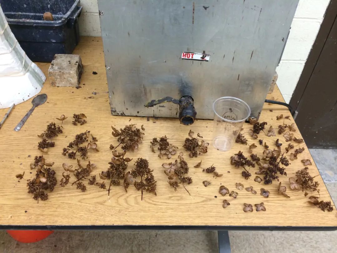 等蠟全部流出去之後,我們就可以把石膏模具倒置在窯爐當中,就是這個畫紅圈的地方,等着玻璃再流進去。我在這個模具的上方架了一個花盆,裏面放的就是我要用到的玻璃原料。等爐子升温到大概900度,玻璃就會漸漸融化,順着花盆底下那個洞流進石膏模具裏面。