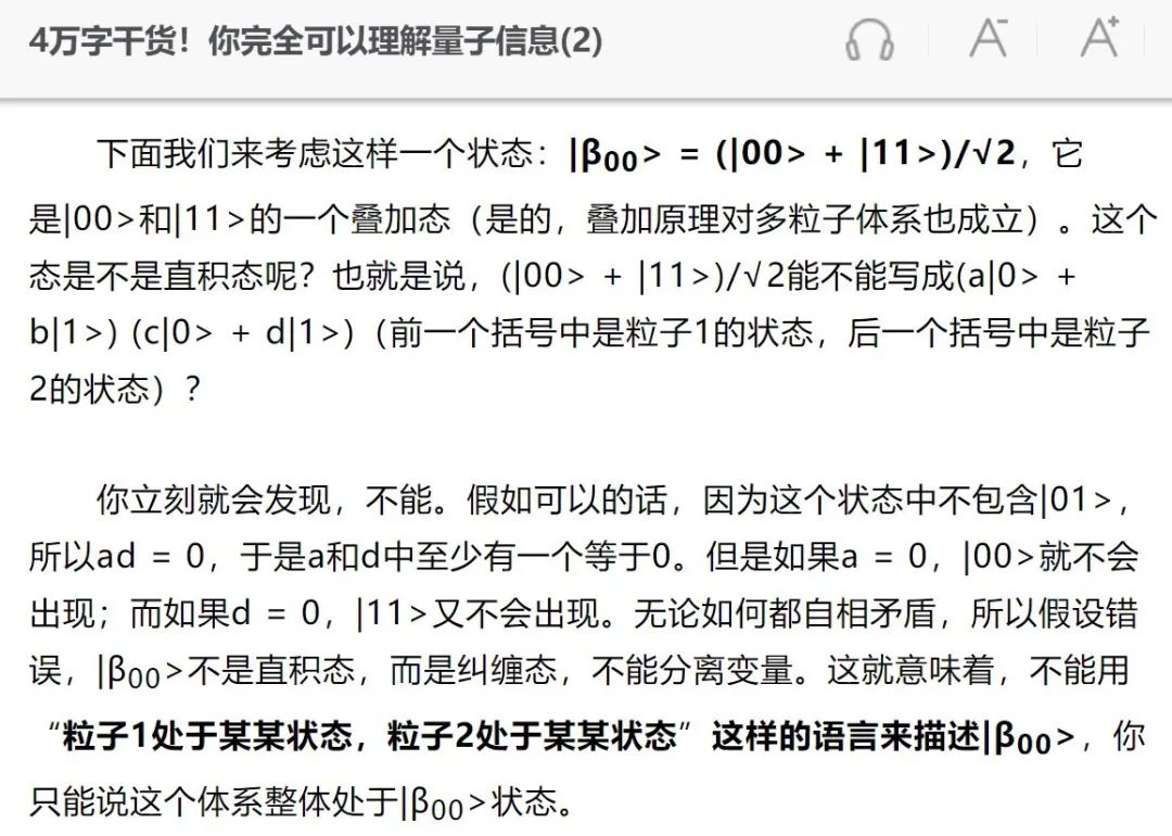 在直積態中,每一個粒子各自都有一個確定的狀態,所以我們可以説這個體系是“粒子1處於某態,粒子2處於某態”。但在糾纏態中,每一個粒子本身都沒有確定的狀態,所以我們不能説這個體系是“粒子1處於某態,粒子2處於某態”,只能説它整體是什麼狀態。